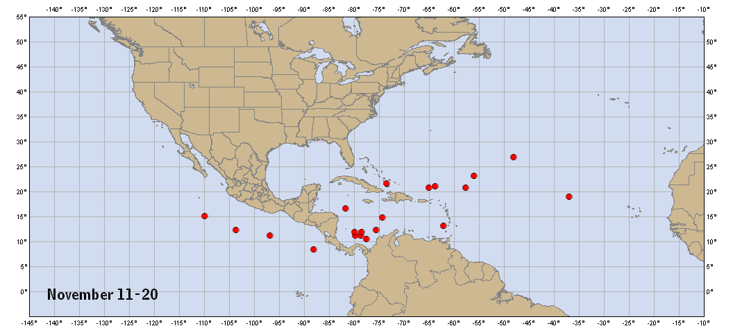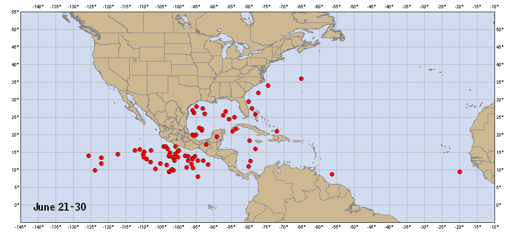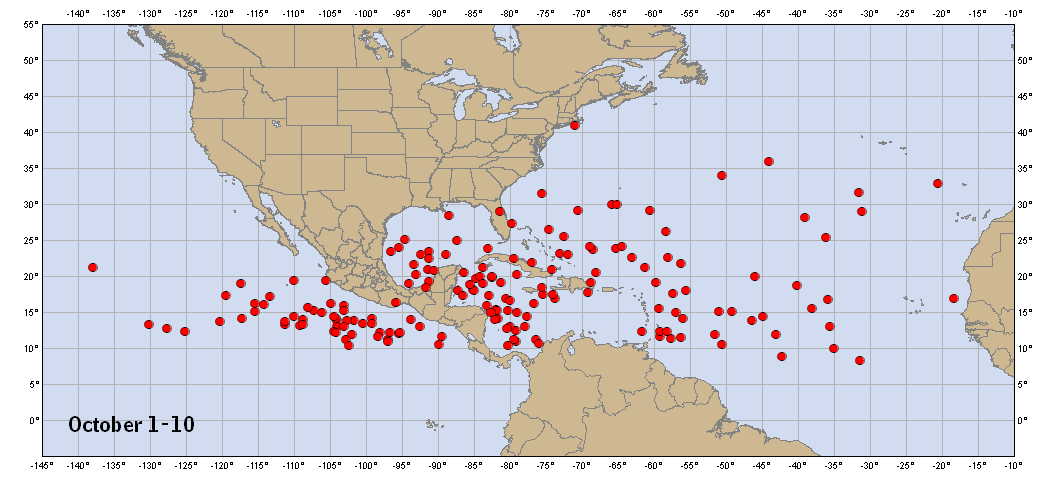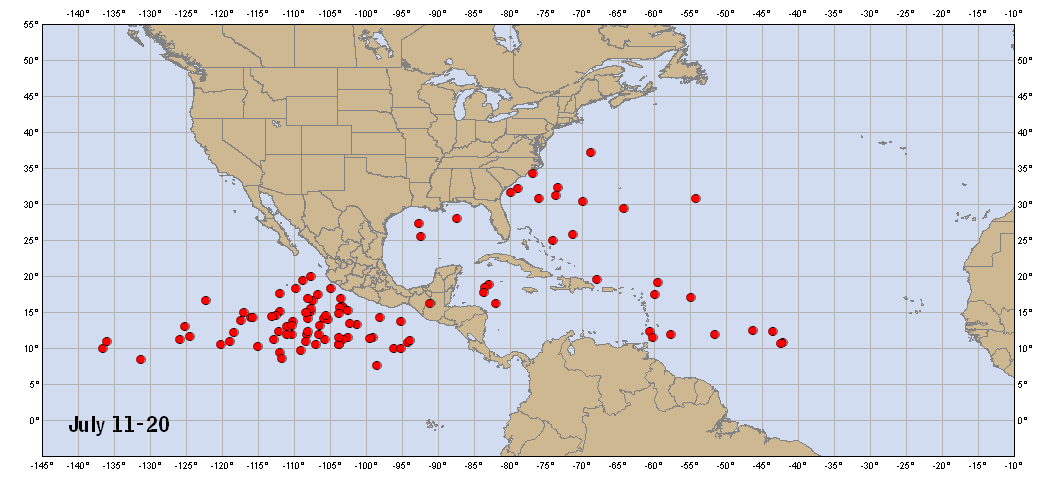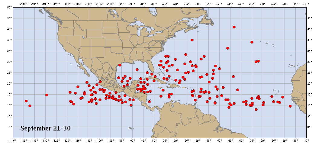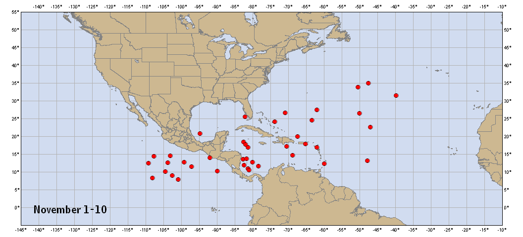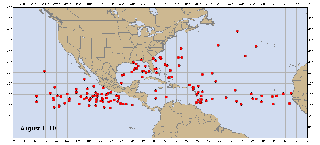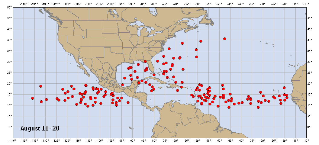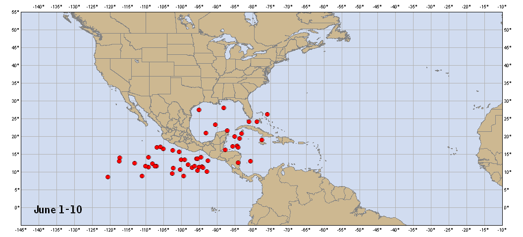 The figures below show the points of tropical cyclone genesis by 10-day periods during the hurricane season. These figures depict named storms only; no subtropical storms or unnamed storms.